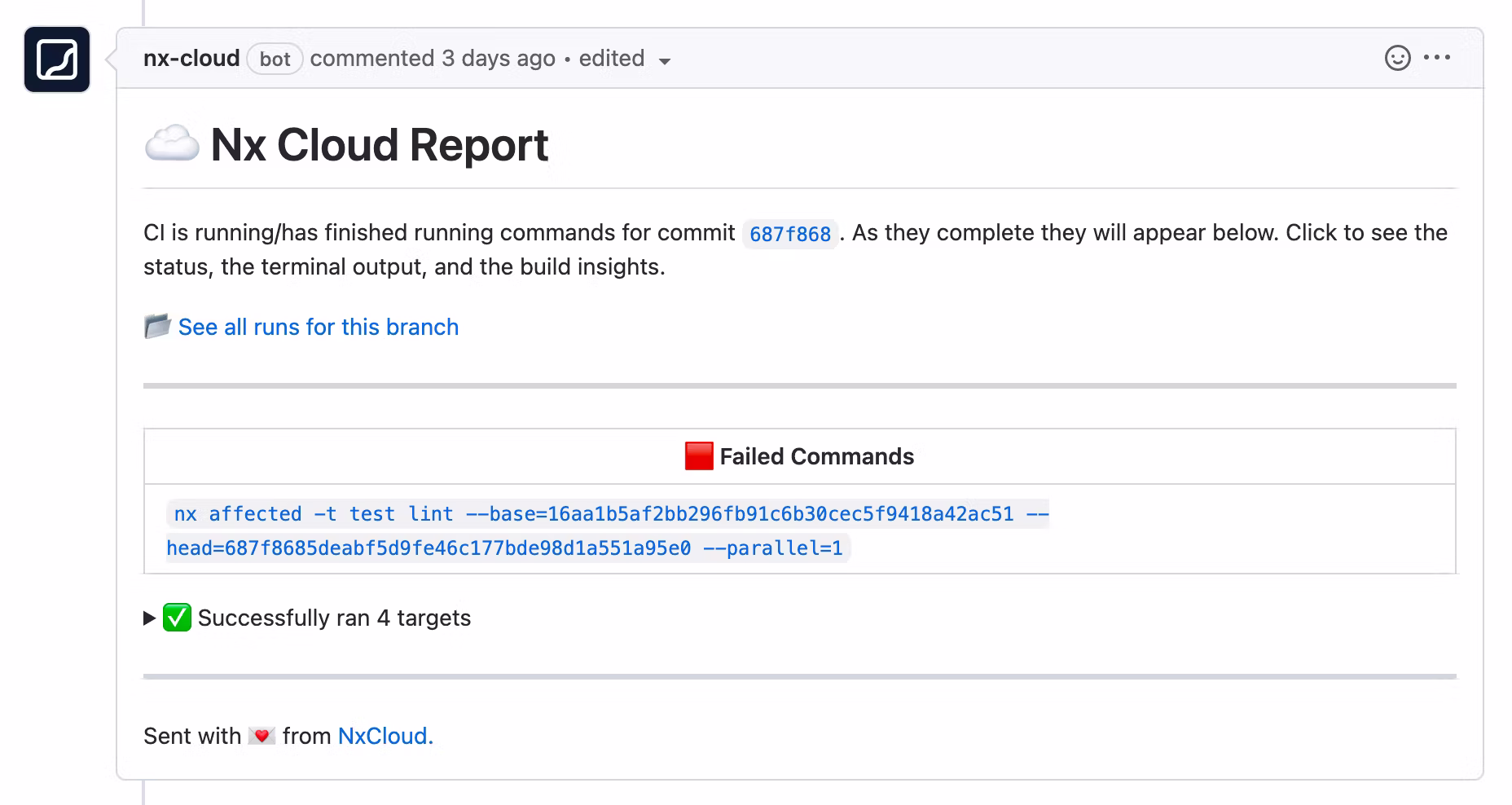 To take advantage of this valuable information without changing your development workflow, use the Nx Cloud integration for your favourite platform: Github, GitLab or Bitbucket Cloud. You can see the results of your cloud runs in a PR comment with an overview of failed tasks and links to easily readable outputs. No more scrolling through endless logs until you find what you need!
